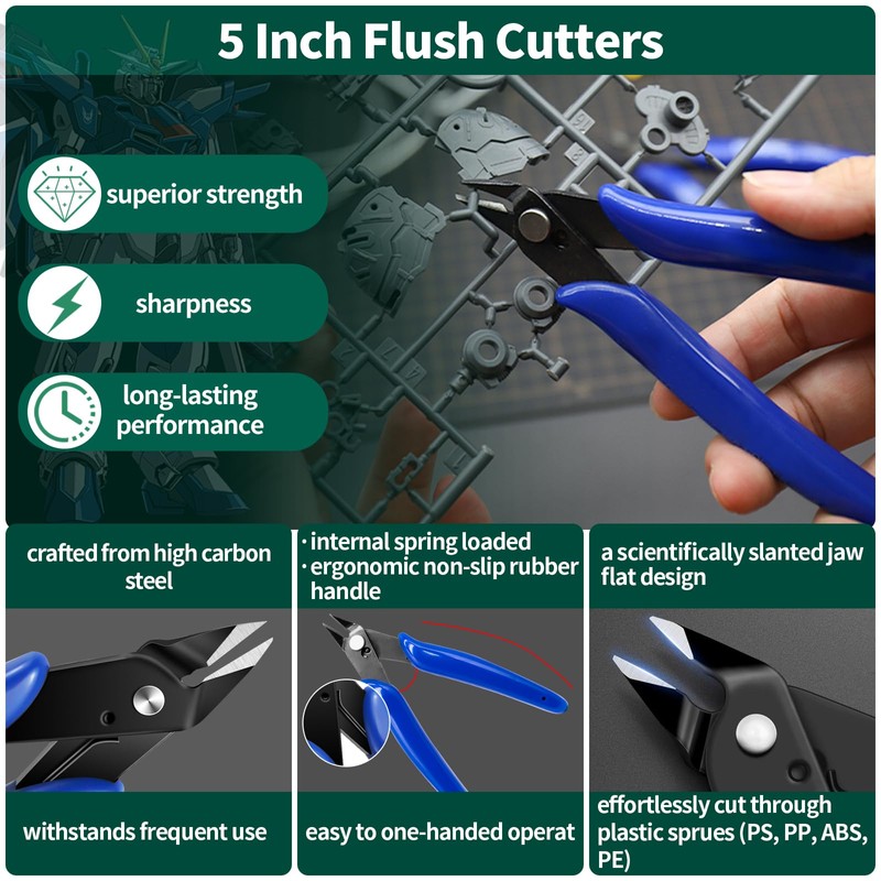 - [Basic Tool for Modeler Stater] The side flush pliers can be used in narrow areas and high-precision cutting tasks, with a scientific flat design of angled jaws for effortless cutting of plastic sprues (PS, PP, ABS, PE). The precision tweezers take moderate elastic tip to reduce work fatigue, which are designed for precise manipulation and extraction. Pen knives are used for removing sprue gates, cleaning up imperfections, trimming decals or stickers.