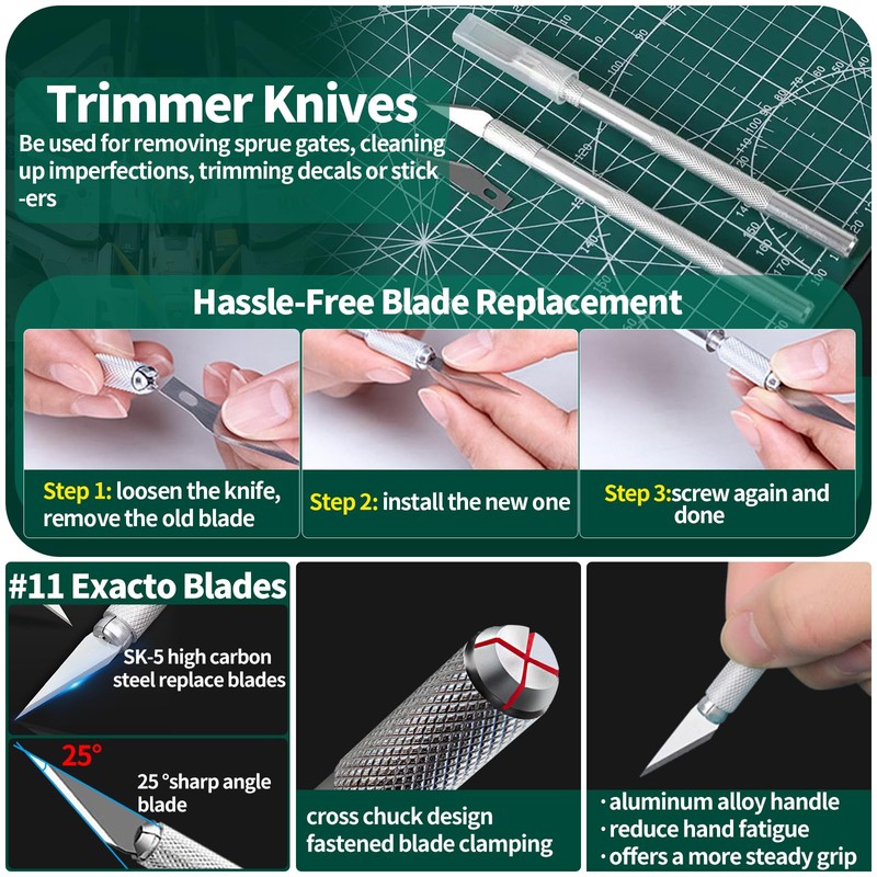 - [Essential Tools for Model Lovers] Great modeler tools for beginner, traveling modeler and professional modeler. Perfect for all kinds of plastic models, like robots, cars, robots, cartoon, buildings, airplanes, airplanes, trucks, cars, mayflower ships, trains and other crafts. In addition, also ideal for DIY handicraft, model building, 3D printing production, art production, repair, research auxiliary work, handicraft carving, template cutting, and other industries.
