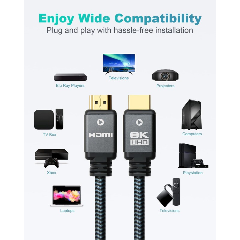 - Enjoy Wide Compatibility: The newest 8K HDMI 2.1 cable is compatible with all your HDMI devices such as Playstation, QLED TV, 8K 4K UHD TV, Blu-Ray players, Laptop, PC, DVD, PS5, PS4 Pro, PS3, Projector, and more. It is simply plug and play, no hassle installation.
