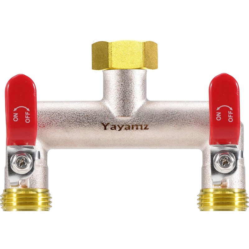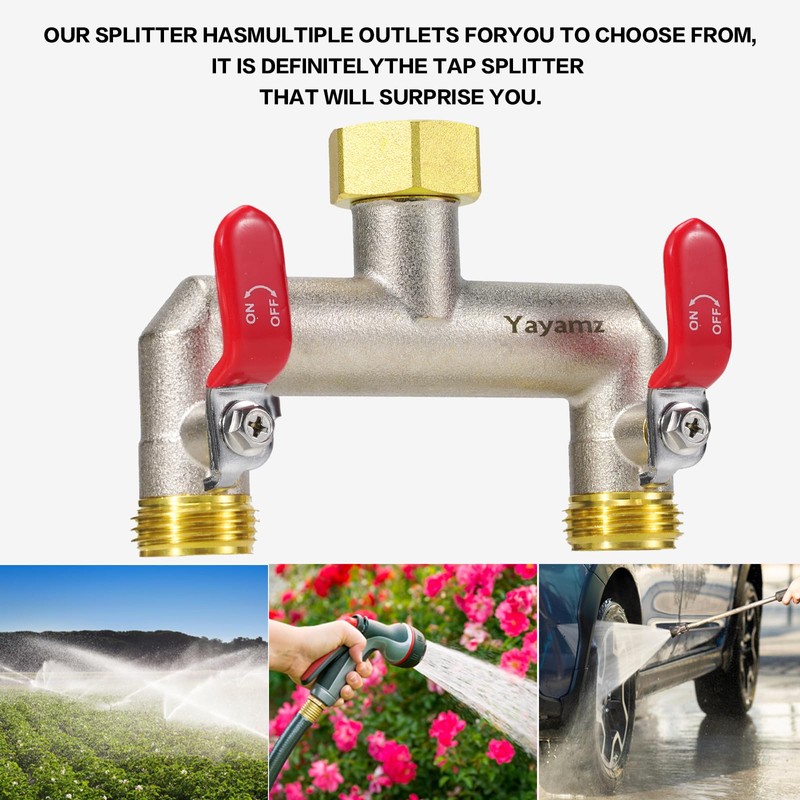 Yayamz 2 Way Garden Hose Splitter, Heavy Duty Brass Nickel Plated Rust Resistant Faucet Manifold, 3/4" Frost Resistant Outdoor Hose Adapter Connector,Hose Spigot Adapter with 2 large red handles