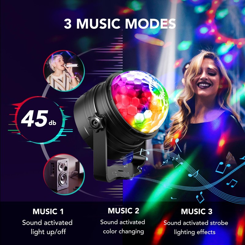 - ✔Disco light party light music controlled, sensitive sound activation function: controlled by DJ vocals, dynamic vocals and strobe sound, it only takes 45 decibels to trigger light and speed changes. Children's laughter, applause or singing can also control remote disco ball.