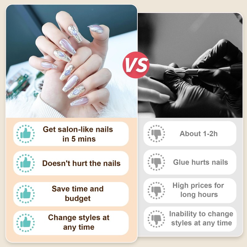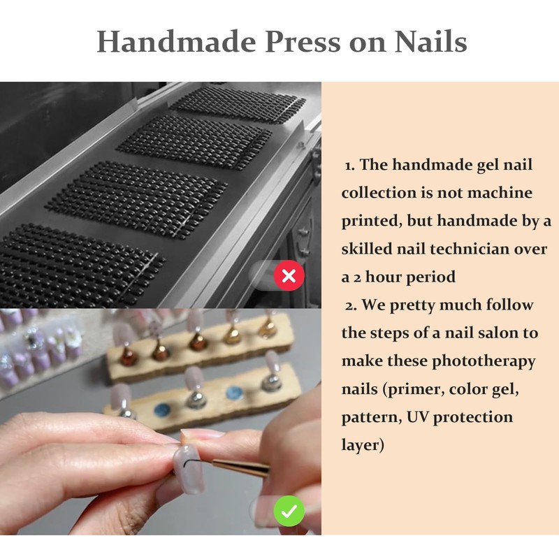 • Quality & Durable: We pretty much follow the steps of a nail salon to make these phototherapy nails (primer, color gel, pattern, UV protection layer). The nail tips are elastic and durable, false nails are gentle on your nail beds and feel like real nails