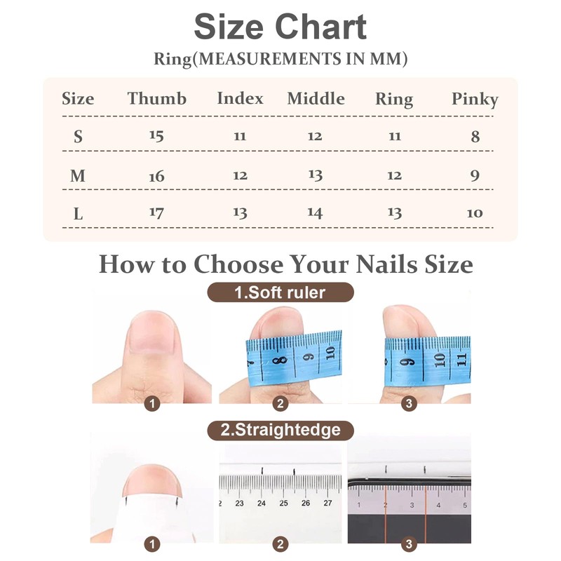 • Multiple Size Options: Press on nails are 3 sizes for each design, please be sure to measure your size carefully before purchasing. If you are between two sizes, it is recommended to choose a slightly larger size, which can make your fingers more comfortable