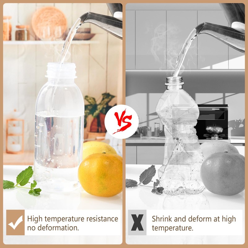 - Heat resistant: The plastic juicing bottles can withstand high temperatures, such as hot coffee, tea, or other hot beverages, without softening, releasing any harmful substances, and supports cold beverages and fresh juice.