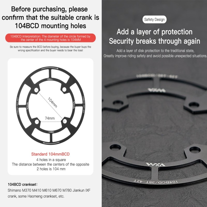 • 1. 🛡 UNIVERSALKOMPATIBILITÄT FÜR 104BCD-SYSTEME - Passend für 32-42T Kettenblätter (2 Varianten: 32-36T / 38-42T), Kompatibel mit: Shimano: M370/M410/M610/M670/M780/XTR, SRAM & Haomeng Kurbelgarnituren, Einheitsgröße: Ein Modell für alle 104BCD-Systeme