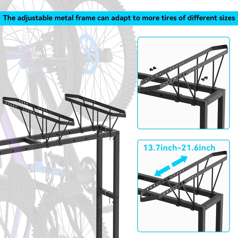 - Adjustable width function: This freestanding bike rack has an adjustable frame width, which can adapt to different models of bikes, including mountain bikes, road bikes or city commuting bikes, meeting the needs of different users and providing a better storage experience.