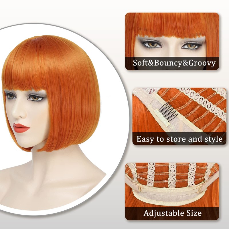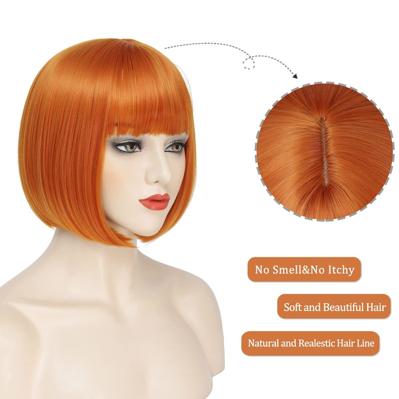 - Occasions:This orange short bob wig with bangs is a perfect choice for Halloween, cosplay, concerts, theme parties, weddings, dating, and any other occasion. The straight orange bob wig worked perfectly for almost any costume. Fashionable and stylish straight bob wig with bangs will make you more beautiful and sexy, just like healthy natural hair does.
