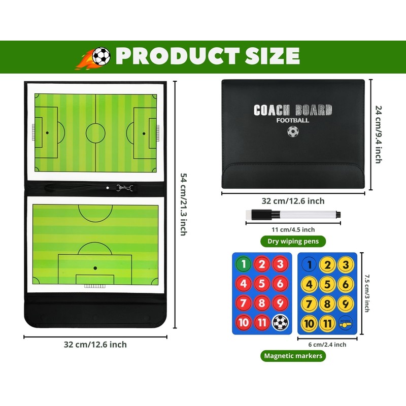 - Package includes 24 magnetic discs + 1 soccer coaching board + 1 pen