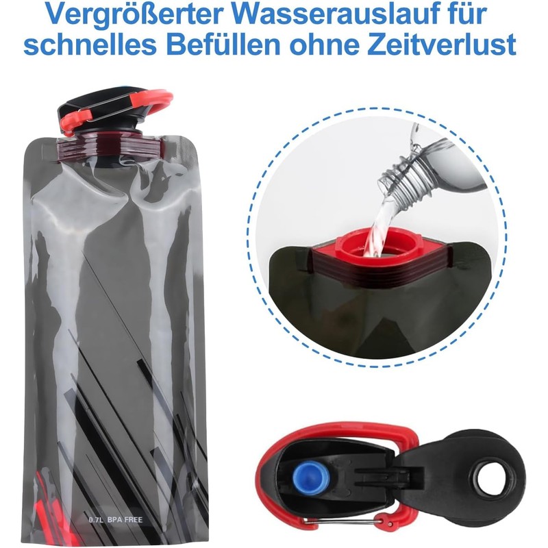 - High-quality water bottle: Our foldable water bottle is made of PE + PA + PET plastic composite material, which is safe and non-toxic, BPA-free, lightweight, healthy and environmentally friendly, leak-proof, airtight and drip-proof. Each reusable hydration bag has a capacity of 700ml, a large capacity for your convenience and replacement