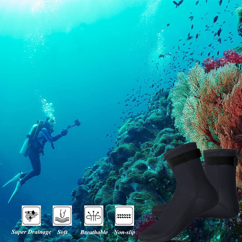 - MULTI-PURPOSES: Multifunctional wetsuit socks are perfect for snorkeling, swimming, spearfishing, scuba, surfing, sailing, kayaking, diving, rafting, canoeing, paddling, wading and other water sports. Note: These neoprene socks' glued and blind stitching can slow down water leaking into it and enhance its durability. Diving socks isn’t a completely water-proof product, but a diving equipment to match wetsuits. Unavoidably water will come through the stitched seams inch by inch.