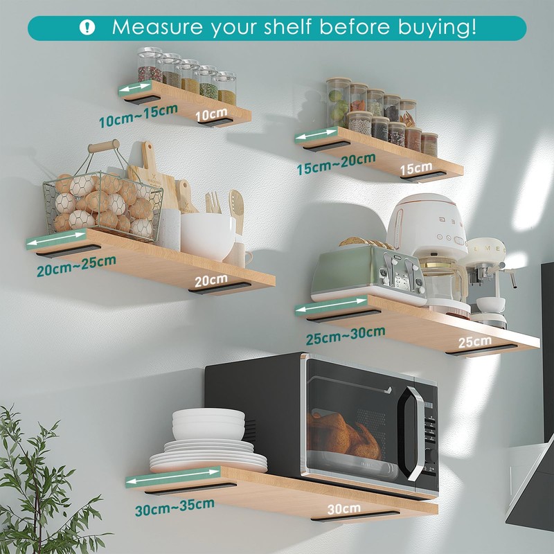 - Unrestricted use of space: these shelf brackets can be used on wooden walls, drywall and hard concrete walls. We have provided brackets in sizes 10cm, 15cm, 20cm, 25cm and 30cm for floating shelves. Choose the right bracket or use it in combination depending on the actual space or size of the boards.