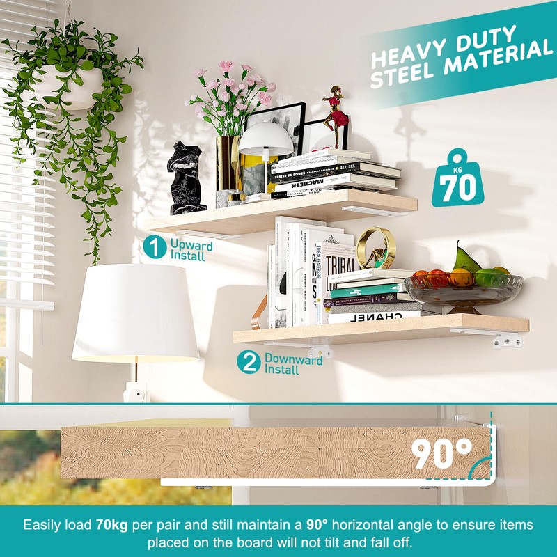 - Robustes Eisen Unsere wandkonsole bestehen aus dickem, robustem Eisen, gestanzt und in einem Stck gebogen, keine Schwei?n?hte, brechen nicht so leicht und sind robuster. Jedes Paar schwebender Regalhalterungen kann bis zu 70 kg Gewicht tragen.