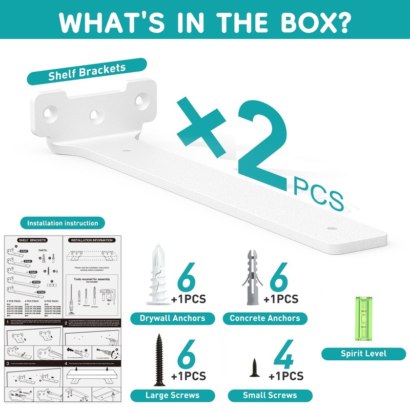 - Komplettes Zubeh?r und einfach zu installieren Bretter sind nicht im Lieferumfang enthalten. Stellen Sie die fr verschiedene Wandmontagen ben?tigten Schrauben bereit. Au?erdem ist eine Wasserwaage enthalten, um die Regalbeschl?ge w?hrend der Installation zu messen und im Gleichgewicht zu halten. Folgen Sie einfach den Schritten, diese Wandhalterung fr Regale kann sogar von jemandem ohne Erfahrung installiert werden.