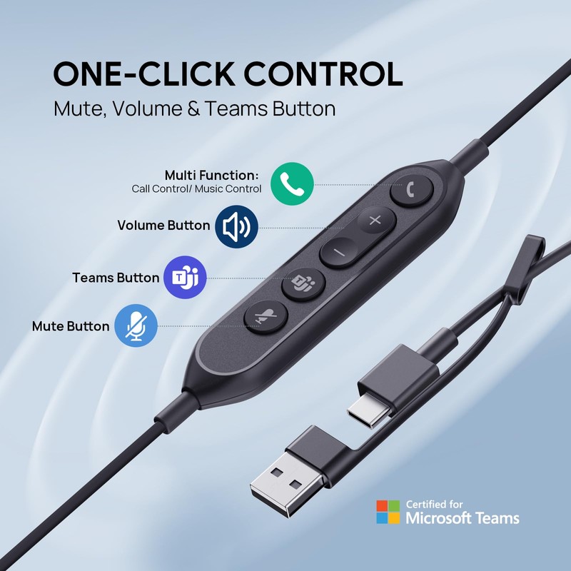 - Smart Controls & USB-C/A Compatible: No drivers needed—this USB PC headset works instantly with Windows/macOS.The 7 foot (2.15m) cable lets you move freely. In line controls feature mute/call buttons, volume control button, and a dedicated Teams button for one-click meeting access.