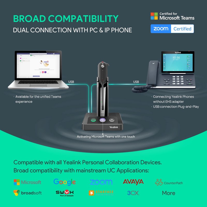 - Easy to Use: No more EHS adapter needed, plug and play. 2 micro USB ports are contained in the base, supporting connecting with computer softphone and VoIP desk phone simultaneously. Compatible with Yealink IP phone T54W/T57W/T48S/T46S/T42S and others.
