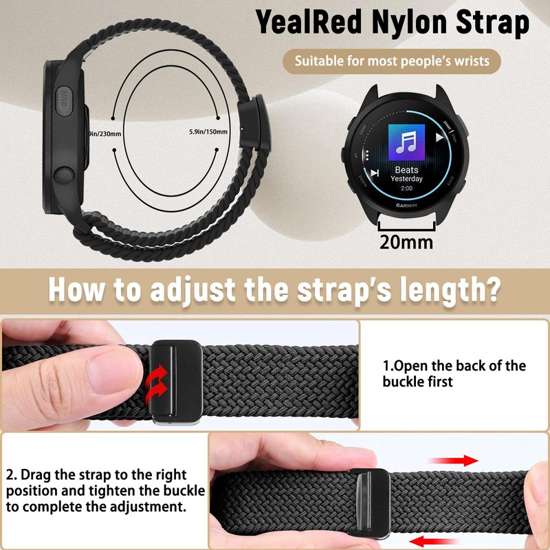 - 【Compatibility】Our 20mm nylon watch strap compatible with Garmin Forerunner 570 42mm/Forerunner 165 / Forerunner 165 Music / Vívoactive 6 /Vívoactive 5 / Venu Sq 2 / Venu Sq 2 music / Venu 2 Plus / Vívoactive 3 / Vívoactive 3 music / Approach S50 /Approach S44/Approach S42 or other more. (Please check whether your watch model and lug width are suitable before purchasing).