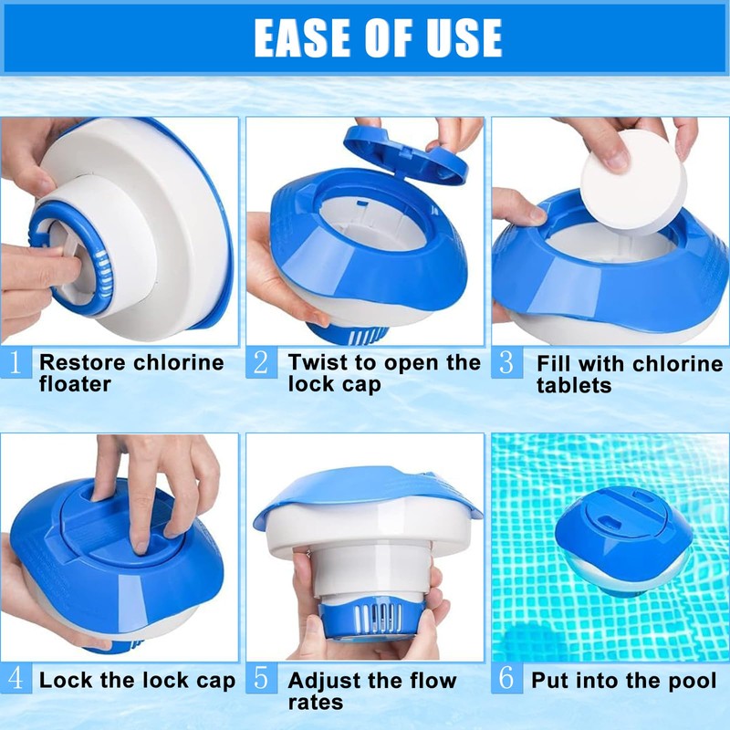 Easy to use: place the chlorine tablets in the chlorine tablet float, adjust the bottom ring to regulate the chlorine dosage, close the lid and let it slide into the water for even distribution of chlorine.