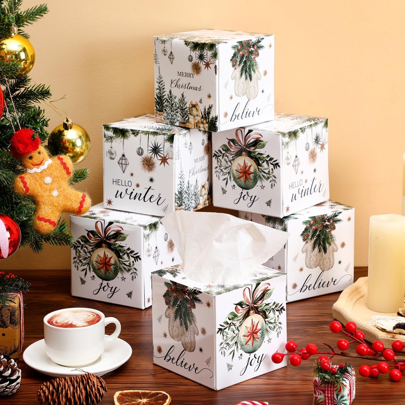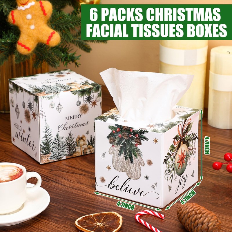Yeaqee 6 Pack 4.7 in Xmas Tree Merry Christmas Large Facial Tissue Cube Boxes 2 Ply 7.1 x 8.7 in Paper Facial Tissues Cube Box Ball Gloves Hello Winter Decoration for Xmas Home Bathroom Kitchen