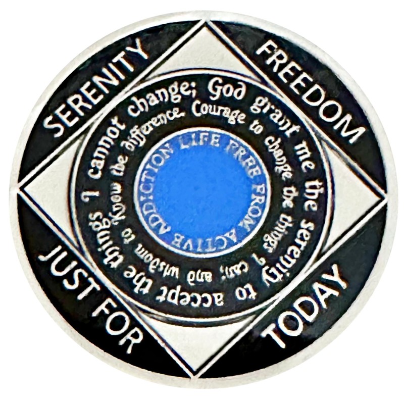 (Years 1-55) NA 1 Year Medallion, Silver, Blue Color Plated, Epoxy Covered Narcotics Anonymous Coin (NA 1 Year Medallion)