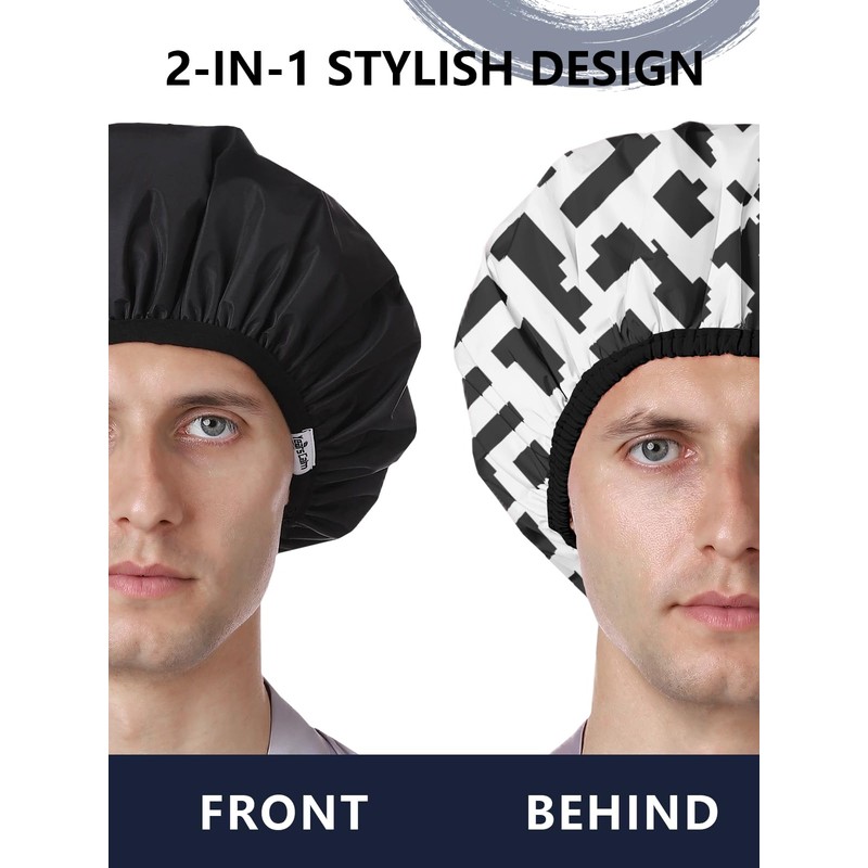 • Double-Layer Design for Added Versatility: This shower cap for men features a double-layer design, with one side solid and the other patterned that won't fade easily, offering two styles in one. It allows for an effortless style switch within 30 seconds. Perfect for business trips, gym and spa, all while maintaining a handsome appearance