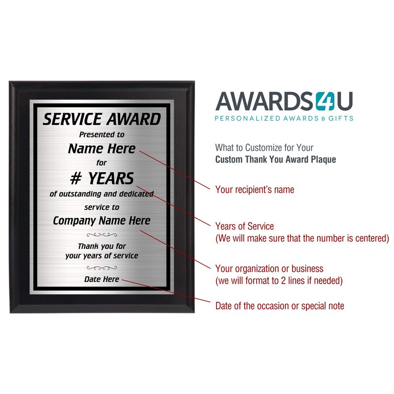 - Choose Your Years of Service - Customize your plaque with # of service years needed for each employee. Recognizing your staff for their accomplishments has been proven to increase loyalty and have a positive impact or moral