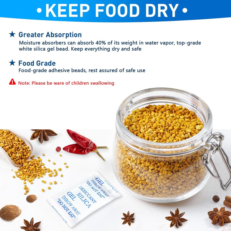 - Food Grade Quality: Made with only food-grade white silica gel beads. These packets do not contain indicating beads and will not change colour when saturated. Our packet material meets strict food safety standards.