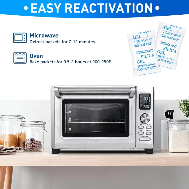- Recycling: Easy Reactivation: Oven: Bake packet for 0.5-2 hours at 200-250F. Microwave: DEFROST Packets for 7-12 minutes.