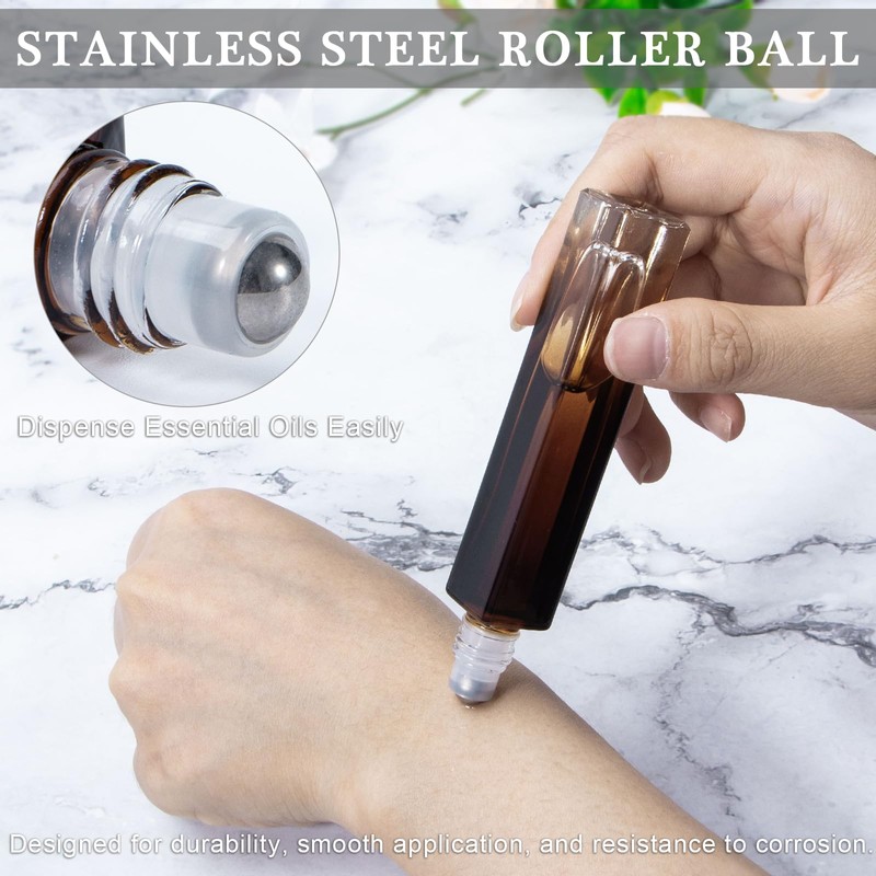 Yebeauty Square Perfume Rollerball Empty, Mini Roller Ball Container for Deodorants, Perfumes and Lip Balms(Amber Gradient Glass, 0.33oz, 12 Pack Roller on Bottles, 1 Opener, 2 Funnels, 2 Droppers)