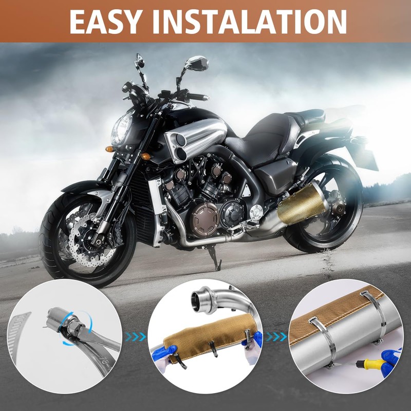 - EASY INSTALLATION: Titanium Tube Guard covers the exhaust pipe and just tighten the hose clamp with a wrench. Due to the special material, gloves should be worn during installation.