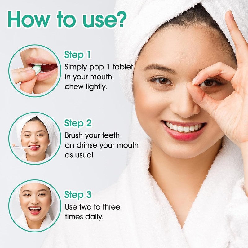 - How to ues: Step one: Take one tablet, crush it with your teeth and chew for about 10-20 seconds. Step two: Apply regular brushing for about 1-2 minutes. Step three: Rinse with water and enjoy the results.