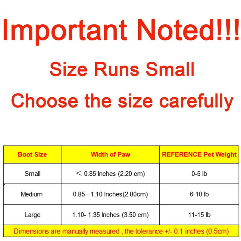 - BOOTS SIZE: Size runs small , please choose the bigger size for your pet from the size chart in the picture (The real size of the boots) ,take care to measure the size of your pet's feet .