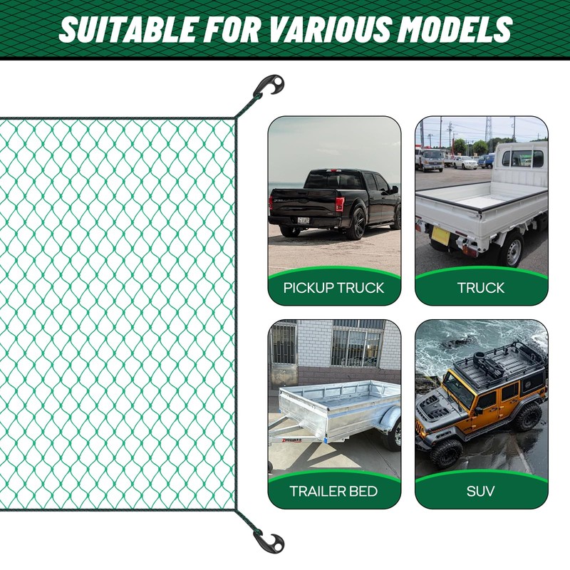- 🚞【Large Coverage Area】Trailer luggage netting is 1.5x2.2m/4.92x7.2ft, is designed to effectively cover and seal your vehicle's cargo area. Perfect compatible for truck, pickups, trailer, cargo carriers, ATV/UTV, Van roof top luggage rack, cargo carriers, and boat to cover some large items, such as baskets, wood, fruits and emergency equipment.