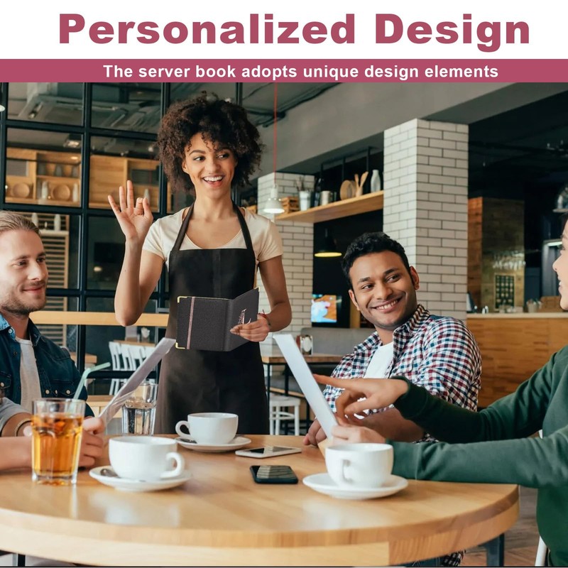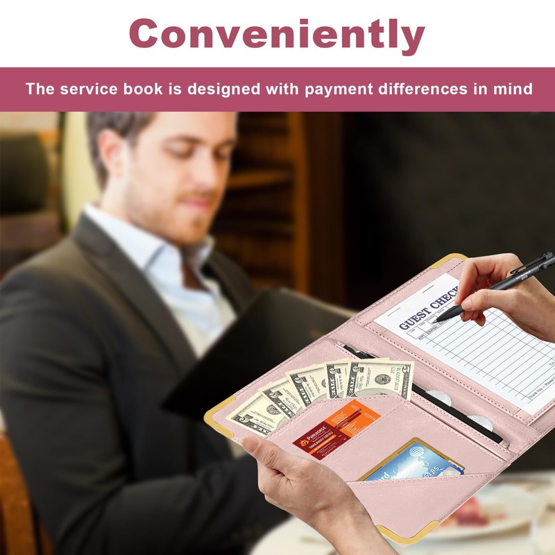 - Festures&Details: This serving books was designed with payment variance in mind and includes 7 detail pieces, credit card payment card slot, coupon menu pocket, bill pocket, coin zipper pocket, cash pocket, guest checkbook, and pen holder. server books is suitable, waitress, server, bartender, restaurant, bar, cafe. You can serve your customers better and be highly organized and efficient with waitress books.