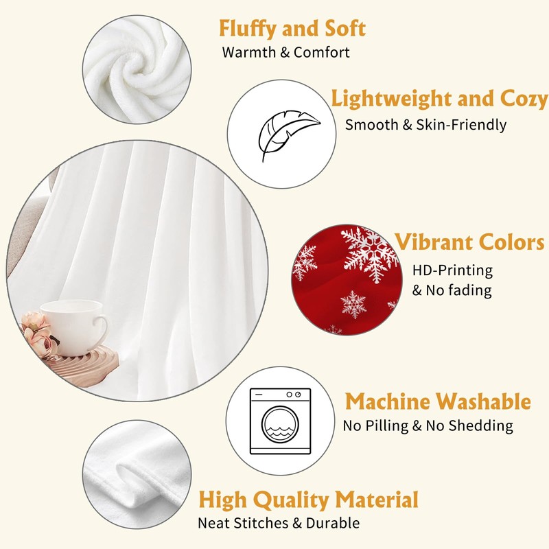 - 【Unique Design】: The Christmas fleece throw blanket is designed with snowflake elements,which is perfect for Winter Holiday theme home decorations.The Christmas decorative blanket can help you change Christmas home decorations quickly and refresh your room. The red christmas snowflake throw blanket is also your perfect partner for vacation, camp and travel.One sided print with vivid colors and the back is pure white with no pattern!
