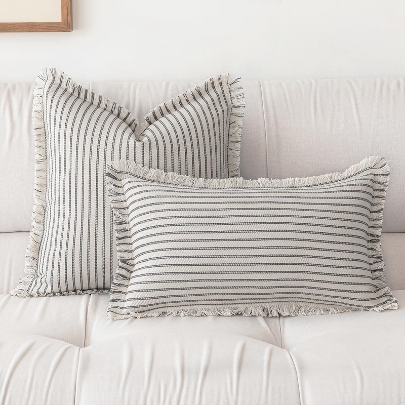 YEENAASY Striped Farmhouse Throw Pillow Covers 18X18 Set of 2 Boho Pillow Cover with Fringe Tassel Chic Cotton Decorative Pillows Modern Neutral Square Cushion Pillowcase for Sofa Couch Bed, Grey