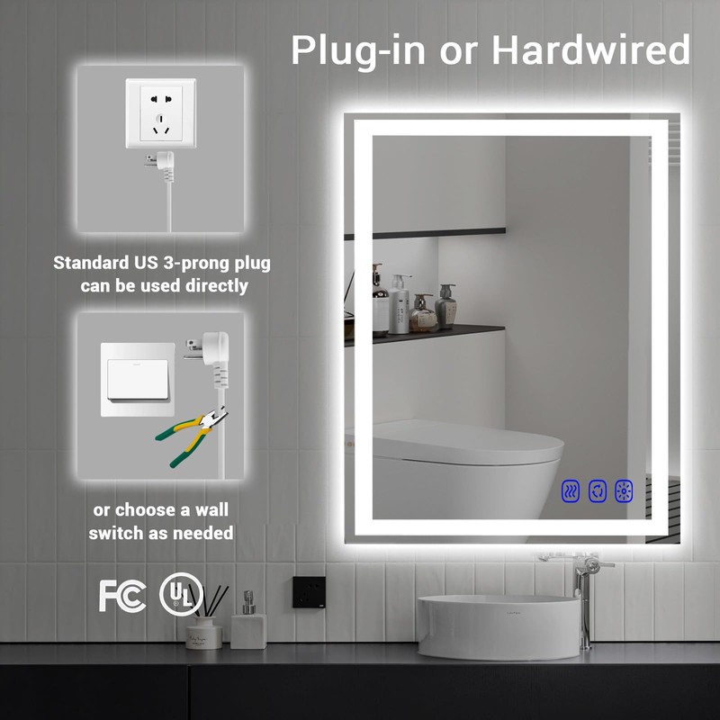 - Plug in or Wall Switch: This lighted bathroom mirror has a standard two-prong plug. You can plug it directly into an outlet for use or hardwire it to be controlled by a wall switch. Both options available. LED vanity mirror lasts over 75,000 hours without wiring mods. The back of the smart mirror uses a high-quality frame to ensure durability and reliability. Install directly in bathroom or bedroom. Normal installation takes 5-8 minutes.