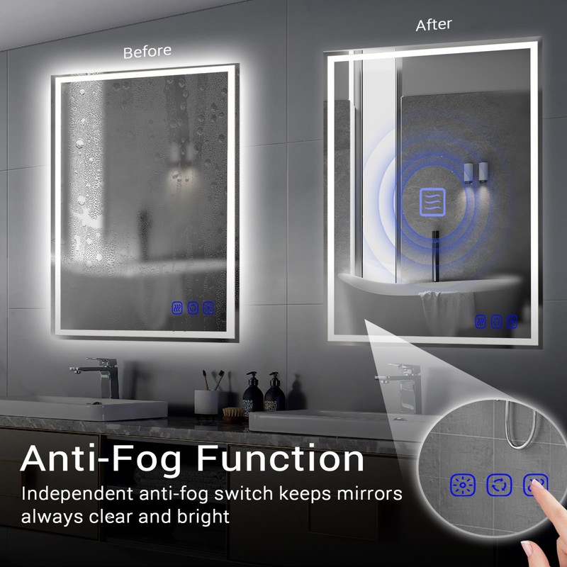 - Anti-fog and Waterproof: The power switch and anti-fog switch are controlled separately. The anti-fog switch can be turned on or off as needed, which is safe and energy-efficient. The IP54 waterproof grade offers environmentally friendly and safe lighting, making it highly suitable for use in sinks or wet environments. Our mirror also features a 50% larger anti-fog area. The defogging function ensures that a clear reflection image can be maintained even in a steam shower or steam.