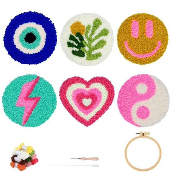 YEESAM ART Punch Needle Kit with Evil Eye Flowers Yin Yang Set of 6 Patterns, Full Set DIY Punch Needle Tufting Coaster Yarn Rug Embroidery Set with Hoop Tool, Easy Craft for Adults Beginners
