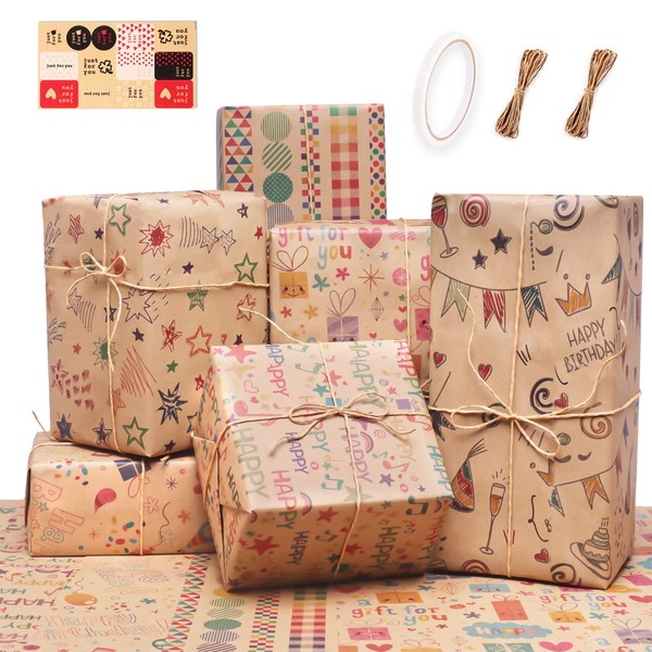 yeestone Birthday Wrapping Paper, 6 Pack Wrapping Paper, Recyclable Wrapping Paper with Double Sided Tape and 10M Straw Rope, Brown Gift Wrap for Men, Girls, Kids, 70 x 50