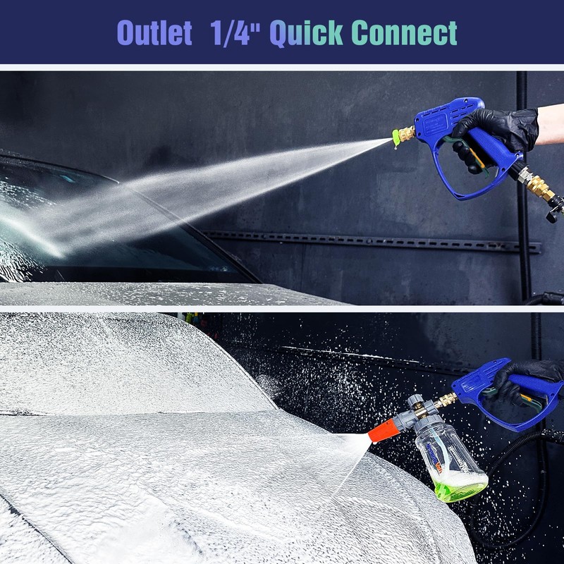 - 【THREE DIFFERENT ADAPTERS】 Swivel pressure washer gun with replacement 3/8" quick connector and M22 14mm & 15mm fittings for universal electric pressure washer, versatile tool for all your cleaning needs. short wand pressure washer foam gun offers compatibility for all your cleaning needs. stainless steel adapters has O-ring better for sealing and no need for tape wrapping (Note: Not Suitable for Garden Hoses).
