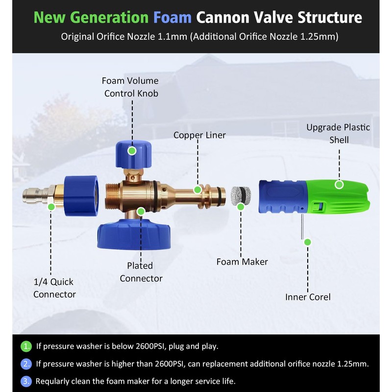 - 【QUICK WASH, PLUG-AND-PLAY】: Power washer foam cannon with 1/4 Inch quick connect can quickly plugged into pressure washer gun, when unscrew the 1/4 connector, foam blaster can be used to M22 connector pressure washer. car foam sprayer original orifice nozzle 1.1mm suitable for below 2600W pressure washer. If your pressure is over 2600 PSI, please use the additional nozzle 1.25mm.