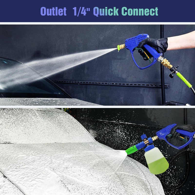 - 【2 NOZZLES FOR VERSATILE】 Pressure washer swivel gun with 2 nozzles (25,40). The brass spring-loaded quick connect allows quick change of universal 1/4" quick plugs nozzle and foam cannon. short pressure washer wand specifically for truck wheel wells and close quarter cleaning. foam blaster makes its perfect for detailing or car washing.