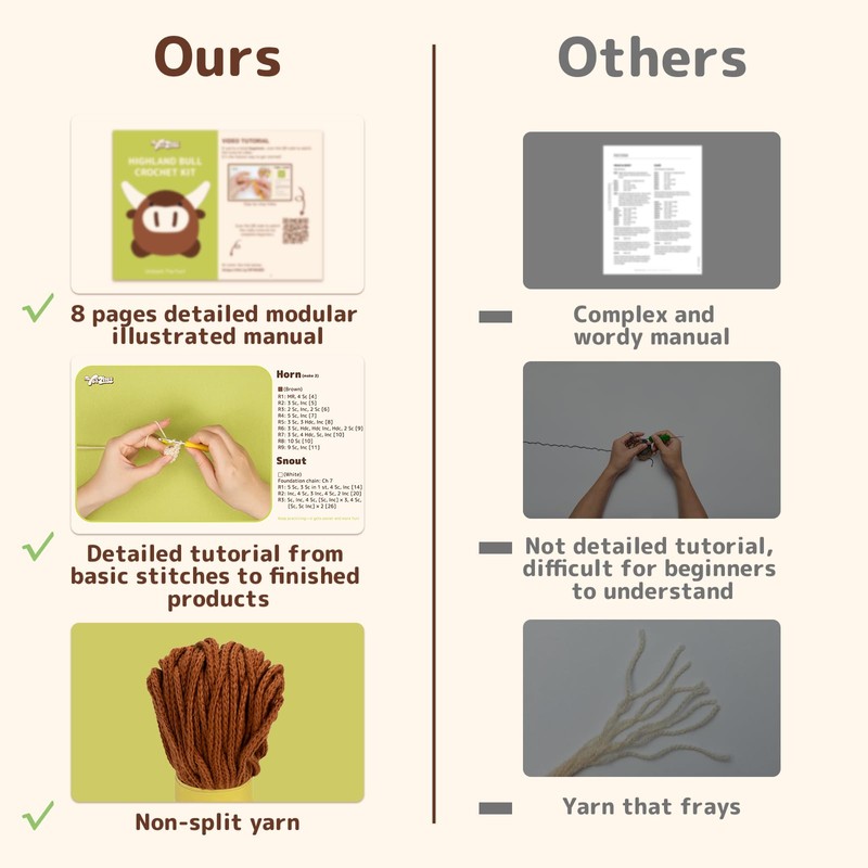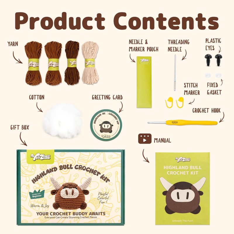 Yeezhee Crochet Kit for Beginners – Complete Amigurumi Animal Starter Set with Step-by-Step Video Tutorials, Yarn & Crochet Hook – Easy DIY Plushie Gift for Adults & Kids (Highland Bull)