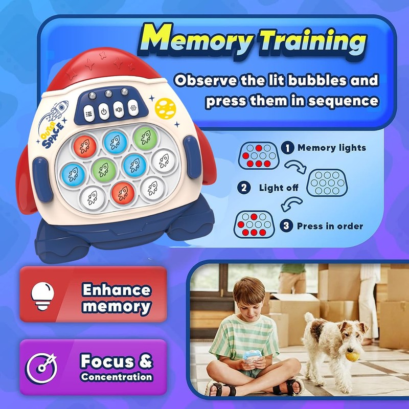 - Upgraded memory game machine: Our handheld game toy has an updated design that combines the classic popping bubble game with traditional handheld game in a fun way to improve hand-eye coordination, reflexes, memory and logical thinking skills. Children aged 3, 4, 5, 6, 7, 8, 9, 10, 11 and 12 years can play anytime and anywhere.