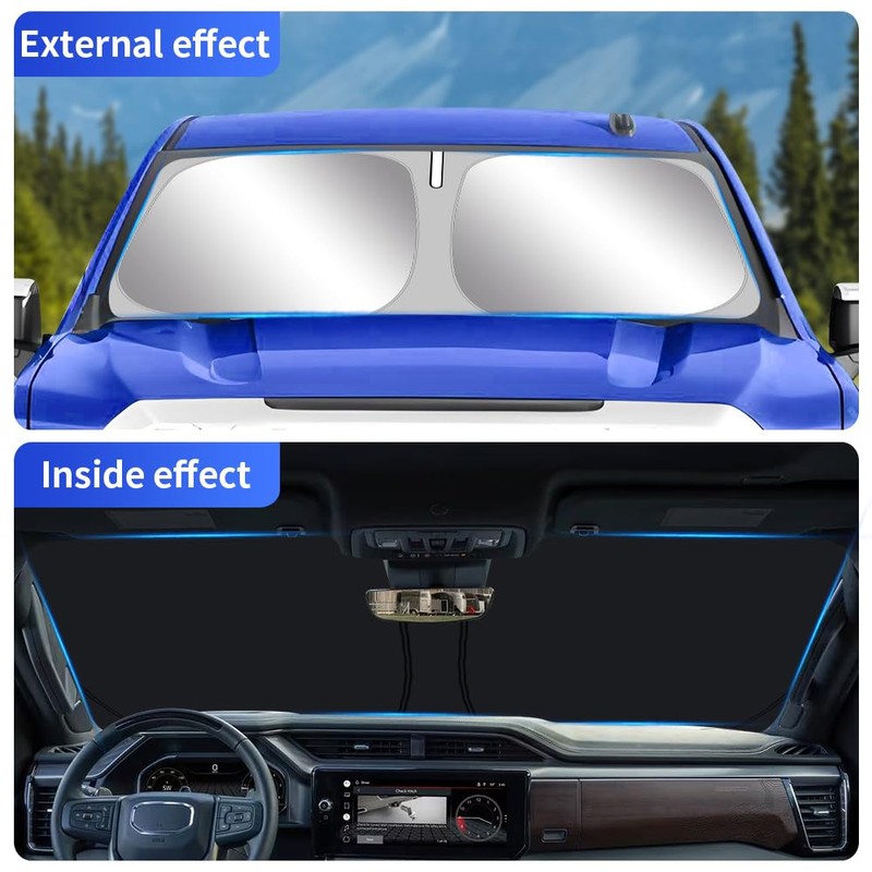 - ✅【Vehicle Specific】Our Windshield Shade Cover custom fit for GMC Sierra 1500/2500/3500 2019-2024. Precise fit design and Reinforced steel rings make a precise and secure fit to the window, no need to use suction cups to hold it in place, No Gap,100% Perfect fit.