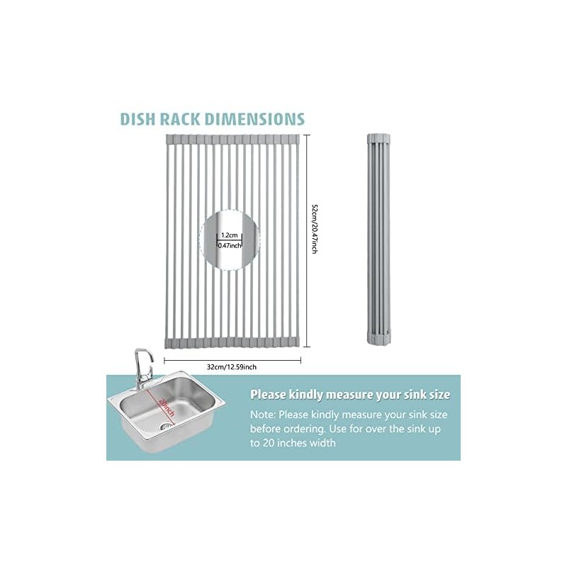- 🍎SMALL SIZE: The size of the roll-up dish drying rack is 16.85 x 12 inches, fits sinks up to 16 inches wide, making it easy to dry any fruits, vegetables, plates, spoons, and more. It can bear 44.09lb. The small-sized foldable draining rack is convenient for storage and doesn't take up space