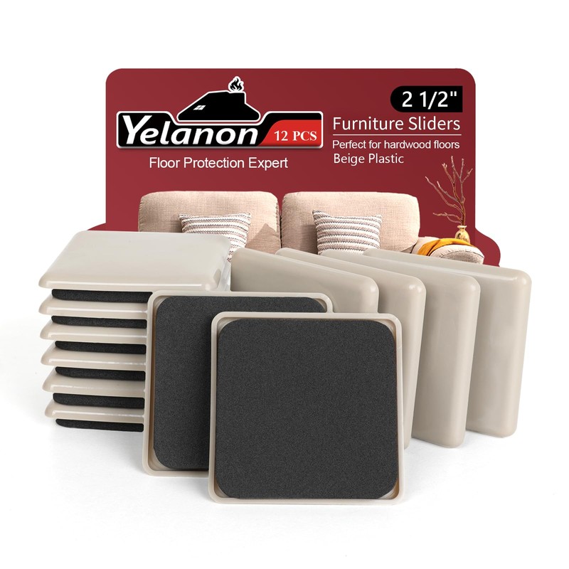 Yelanon 12pcs-2 1/2” Square Furniture Sliders for Carpet Furniture Pads Hardwoods Floors, Heavy Duty Furniture Movers Sliders,Moving Pads, Floor Protectors for Carpet,Beige