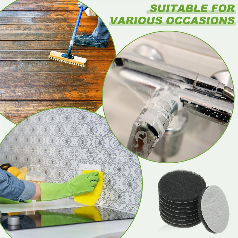 • Feature: Our scrubbing pads are made from emery and nylon fibers, combining scrubbing power with surface care. Its oil- and water-resistant material withstands wet and dry conditions, and the backing ensures it stays firmly in place on the drill holder without slipping, even at high speeds.