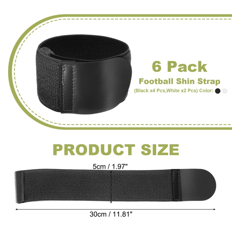 - PACKAGE SPEC - Shin Guard Strap Size: 30 x 5cm / 11.81 x 1.97 Inch (L x W); Color: Black/White; Material: Latex Core, Polypropylene; Packing List: 6 Pack x Football Shin Strap