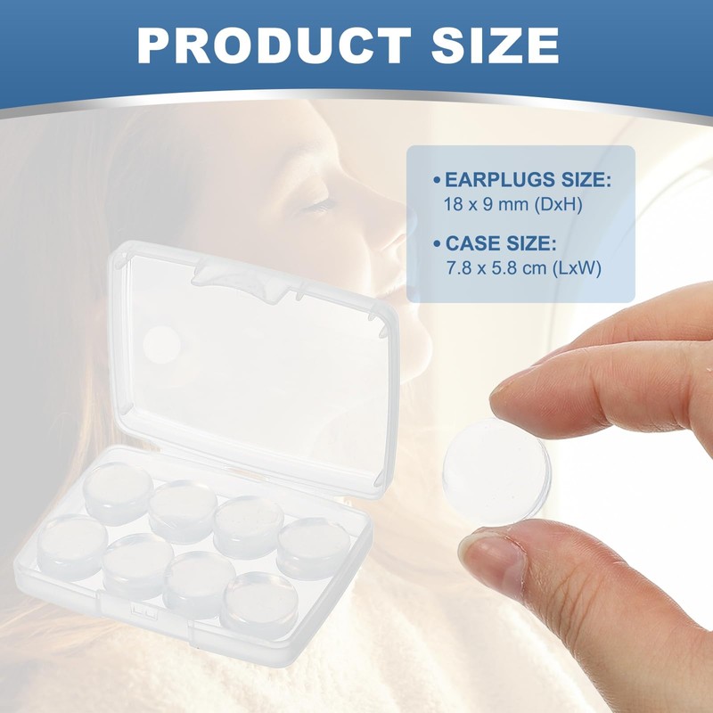 DURABLE MATERIALThe sleeping earplugs are made of soft silicone material, the moldable earplugs are lightweight and comfortable to wear even for a whole day. Also, the moldable earplugs are reusable, easy to shape, so you need to clean them regularly and leave them to dry naturally for future use.MULTI-APPLICATIONSilicone ear plugs can effectively reduce noise and protect hearing from loud noises. The reusable earplugs are a great choice for sleeping, traveling, sport, music, swimming, or anywhere you need to block out background noise. Providing you with a quiet rest/ working environment.KEY POINTSNoise-blocking Comfort- The silicone earplugs for sleeping can achieve a perfect fit for uninterrupted sleep. Enjoying the ultimate in noise-blocking comfort with the moldable earplugs. Achieve restful sleep and wake-up feeling energized.Waterproof Ear Protection- These silicone earplugs have a good waterproof function, which can protect your ears from water when swimming, showering, or other water sports. Enjoy worry-free swimming with the ear plugs. Designed to protect your ears from water, they fit securely and comfortably.PARCEL CONTENTColor: Clear WhiteMaterial: SiliconeEarplugs Size: 18 x 9 mm/ 0.7 x 0.35 inch (DxH)Case Size: Case Size: 7.8 x 5.8 cm/ 3.07 x 2.28 inch (LxW)Noise Reduction Level: 27dBPackage Content: 10 Pack x Earplugs for SleepTIPSThe package comes with 1 big box and 1 travel-size storage box to keep these reusable sleeping earplugs clean when not in use, friendly to travelling and daily commuting, and also prevents loss.